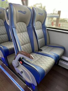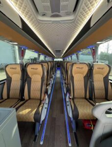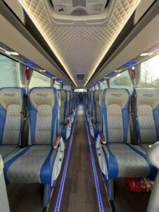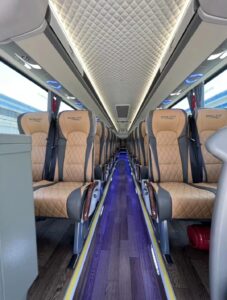 Comfort & luxury – air suspension, reclining leather seats with 3‑point seat belts, A/C, USB/Wi‑Fi options, creating a modern coach experience .