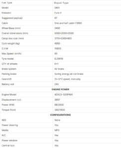 The GM3 is a 6-ton capacity Euro-II compliant diesel truck with 6000×2000×2500mm dimensions and a 3710×2000×800mm cargo box. Powered by a 3.9L FAW 4DX23-120 engine delivering 88kW/340N·m, it achieves 90km/h top speed via (5+1)×2 manual transmission. Features include air brakes, spring parking brake, and 6+1 wheel configuration (8.25R16 tires). With 4,850kg curb weight and 10,850kg GVW, its one-and-half cabin (1900mm) design is built for heavy-duty commercial transport.