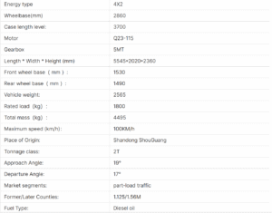 The K6 is a versatile 4×2 diesel truck featuring 5,545×2,020×2,360mm dimensions with an extended 3.7m cargo bed. Powered by a Q23-115 diesel engine and 5-speed manual transmission, it delivers 100km/h top speed and 1,800kg payload capacity. The 2.86m wheelbase and 19°/17° approach/departure angles ensure excellent stability and maneuverability. With 4,495kg GVW and optimized 1.125/1.56M weight distribution, this Shandong-manufactured workhorse is ideal for part-load transportation and urban logistics operations.