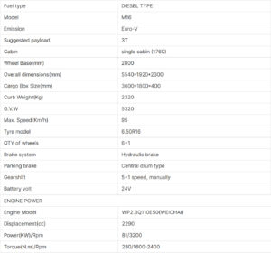 The KAMA M16 is a 3-ton capacity Euro-V compliant diesel truck with 5540×1920×2300mm dimensions and 3600×1800×400mm cargo box. Powered by a 2.3L WP2.3Q110E50 engine delivering 81kW/280N·m, it achieves 95km/h top speed via 5+1 manual transmission. Features include hydraulic brakes, central drum parking brake, and 6+1 wheel configuration (6.50R16 tires). With 2,320kg curb weight and 5,320kg GVW, it’s ideal for heavy-duty urban logistics.