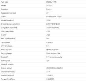 The X3 is a 2-ton capacity Euro-II compliant diesel truck with 5660×1840×2120mm dimensions and 2500×1750×360mm cargo box. Powered by a 2.8L Isuzu JE493ZLQ3A engine delivering 75kW/240N·m, it achieves 90km/h top speed via 5+1 manual transmission. Features include hydraulic brakescentral drum parking brake, and 6+1 wheel configuration (6.50R15 tires). With 2,120kg curb weight and 4,120kg GVW, its double cabin (1750mm) design is ideal for crew transport and light logistics.