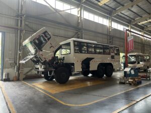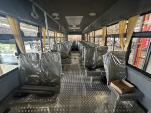 Spacious 30-seat cabin with reinforced safety features for worker transport.
