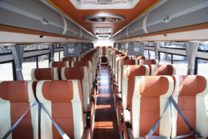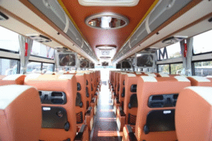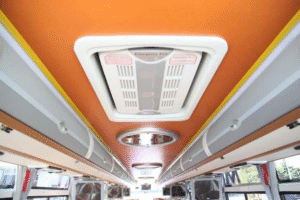Equipped with air conditioning, multiple ventilation options (skylights, sliding windows), durable fabric seats, and essential amenities like LED lighting and USB ports for a comfortable passenger experience.