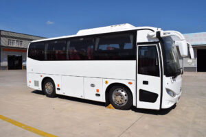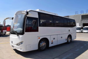 Offers 29-passenger capacity (27+1+1 seats) with 16,000kcal air conditioning, LED lighting, USB/Bluetooth connectivity, and ergonomic seating for optimal comfort during transit. -