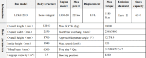 This 12-meter semi-integral coach features a L300-20 Euro II engine (221kW/1180N·m) with FAST 6DS150T transmission, delivering a 120km/h max speed. The 60+1 seat layout offers comfort with fabric seatsskidproof flooring, and through-type luggage racks (9.5m³ capacity). Safety includes ABSeddy current retarder, and automatic fire suppression. Amenities include dual LCD screensUSB chargers, and 30,000kcal/h A/C.