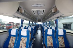 Offers 49 premium 2+2 leather seats with adjustable armrests, LED ambient lightingArabic-labeled mirrors, and WiFi connectivity for a first-class travel environment.